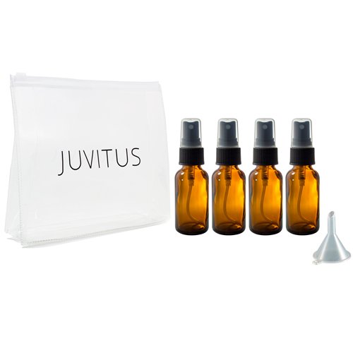 Amber 1 oz Glass Fine Mist Spray Bottles (4 pack) + Clear Travel Bag and Funnel