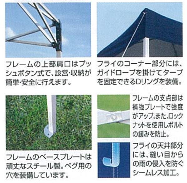 | 素材・材質 | フライ: ポリエステル150D・シルバーコーティング(1000mm防水)、UV加工 フレーム:支柱/アルミ、ルーフ・クロスバー/鉄(紛体塗装) |