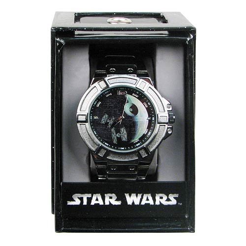 -. Feature : The full power of the Galactic Empire can now be worn on your wrist! / This Star Wars Death Star Dial Watch features a cool image on the face of the watch of a couple TIE Fighters patrolling the area around the Death Star. / Featuring a cool silver/black design and metal bracelet, fans of Star Wars and the Imperial Forces would love to wear this bad boy around! / Watch is about 8 inches long. Bracelet is 1 inches wide. Watch case measures about 1.95 inches in diameter. / Watch is shipped with a crown stopper, protective film of the glass/crystal, and a protective film/sticker on the caseback. The crown stopper prolongs the battery.