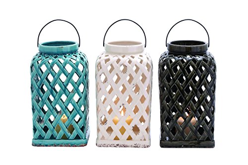 -. Feature : This ceramic lantern measures 8 inches (width) x 8 inches (l) x 14 inches (height) each / Sleek curved black handle / Turquoise, white and black finish