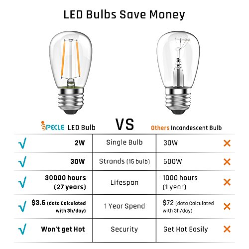 - 【Dimmable 15 Piece S14 LED Bulb Save Your Money Back】 Save more money on your electric bill when you select this LED bulb gazebo lights than the incandescent bulb since these eletric string lights adopt 15 pieces of 2W LED Edsion filament bulb(Color Temperature is 2700K & 200lumens per bulb) ; this LED bulb's lifespan (30000 hours) is 26 times longer than the incandescent one, energy comsumption rate is only 5% of incandescent ones; Plus, LED bulb won't get hot