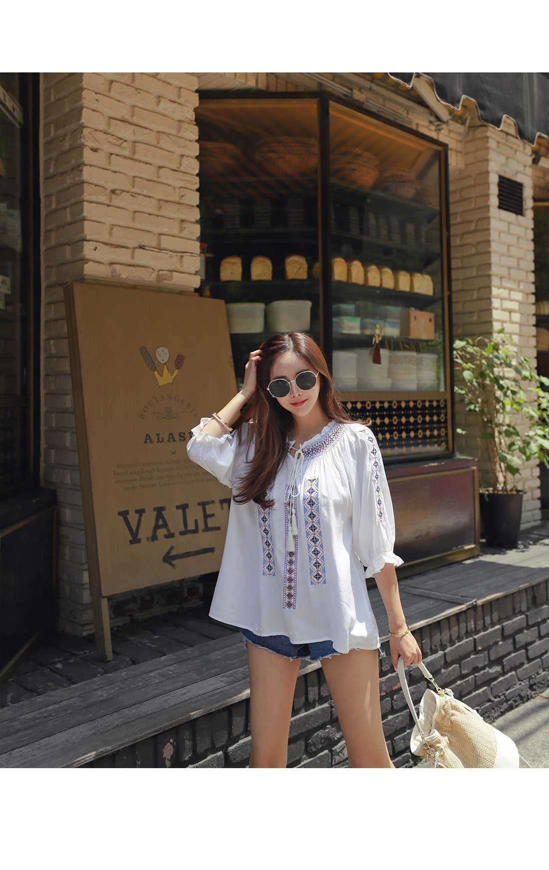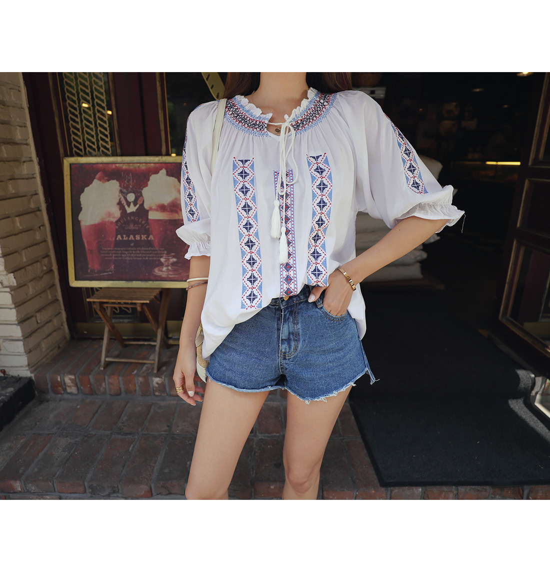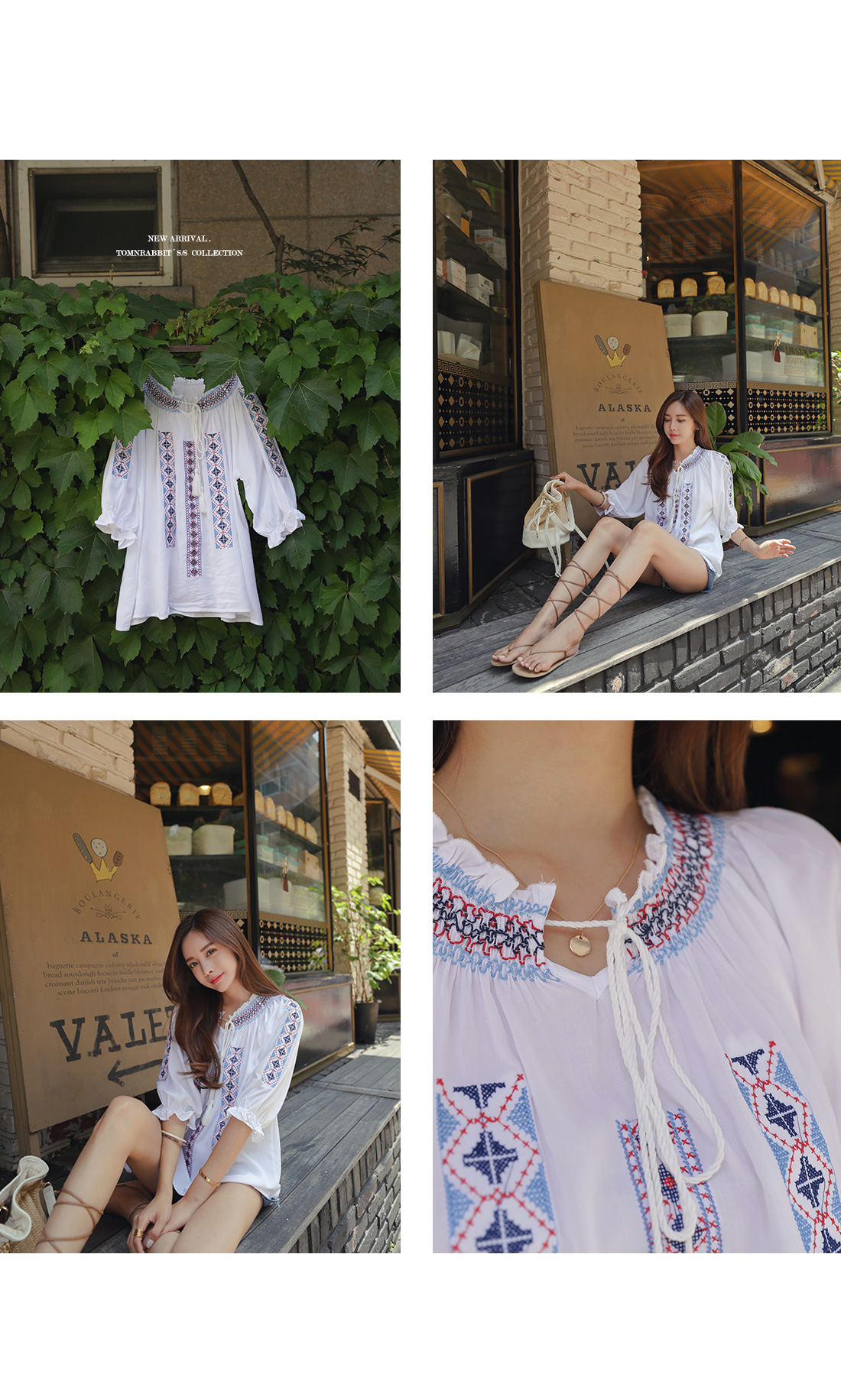 MD COMMENT 에스닉한 무드의 자수 포인트 브리즈 블라우스 소개할게요.부드럽게 연출되는 라운드 네크라인을 둘러예쁜 쇄골라인과 목선을 연출해주었는데요셔링밴드로 연출되어 오프숄더로도 가능해요^^전체적으로 자수 패턴이 걸리쉬한 무드를 연출해주었어요.소매라인과 네크라인을 따라 프릴로 로맨틱하구요 프론트 태슬 디테일로 은근 러블리한 포인트를 더해 주었으며트렌디한 디자인 포인트를 더해 주었어요.여유있는 핏감으로 부담없이 편안하게 즐기기 좋으며 활동성을 갖춰 주었답니다!모델이 착용한 것처럼 데님팬츠와 매칭이 좋으며걸리시한 분위기를 완성 시켜줄 블라우스 아이템으로 추천해요!밝은컬러는 비침이 있을수 있으니 참고해주세요:)COLOR/SIZE 아이보리,네이비FREEMODEL FITTING 아이보리/FREE