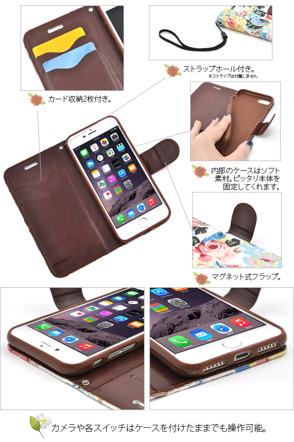 開閉はマグネット式で、使い勝手の良い手帳型です。またストラップホールもついています。