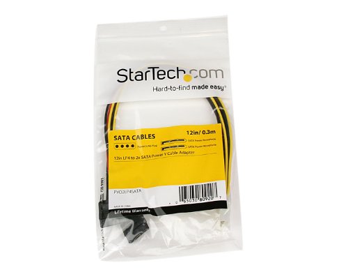 This 12in LP4 to SATA Power Y Cable Adapter features two Serial ATA power (female) connectors and one LP4 male connection - a reliable solution that lets you power two SATA drives using a single LP4 connection to the computer power supply. This durable LP4/SATA Y cable adapter is 1ft in length, giving you enough cable slack to position drives as needed within the computer case while saving the cost and hassle of upgrading a power supply for compatibility with Serial ATA drives. Expertly designed and constructed of top quality materials, the LP4/SATA Power cable is backed by StarTech.com''s Lifetime Warranty.