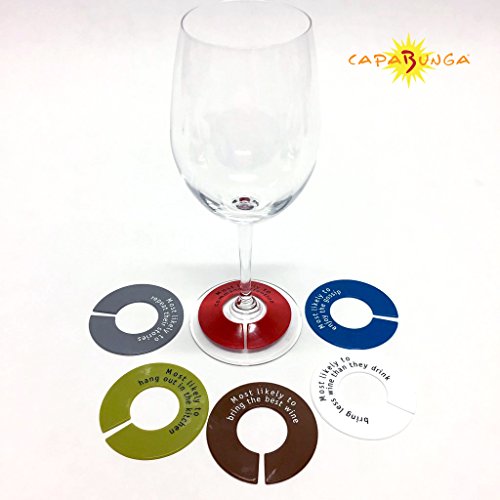 -. Brand : CapaBunga -. EAN : 0858720003418 -. Feature : Six unique slogans to decorate each wine glass / Made to write on, wipe off and reuse / Made with Silicone for easy cleaning and durability / Silicone keeps it in place on the base of any stemmed glass -. ProductGroup : Kitchen -. ProductTypeName : KITCHEN -. Title : CapaBunga Slogan GlassWhere Wine Glass Tags, 6 Pack, Muted -. UPC : 858720003418