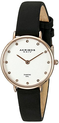 Studio : TWI Watches, LLC Publisher : TWI Watches, LLC Binding : Watch Product Description This AKRIBOS XXIV timepiece is one of the smallest in the company's line of elegant Women's designs. Its case measures just 28mm in diameter and features a beautiful polished rose gold tone finish with a white matte dial and genuine diamond markers. Powered by a highly accurate and reliable Miyota quartz movement, this beautiful timepiece is both functional and a work of art for your wrist. It is accented with slim black genuine leather strap. 0