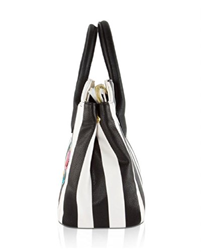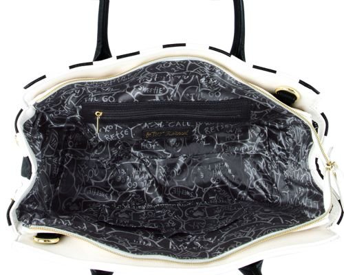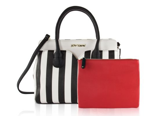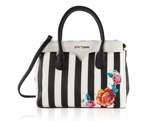 Two bags are better than one Betsey Johnson Pouch Dip Bag has plenty of space for everything and plenty of style for anything. Exterior front Features 3 embroidered flowers with gold tone studs & Front heart shaped slip pocket with red zippered Wristlet pouch that ensures stylish flair, Double Handles 5" Drop, Removable shoulder strap 23" Drop, Fully Lined printed Interior with Wall zipper pocket and 2 Slip Pockets. Tote: 13" x 11" x 4" (WxHxD) Detachable adjustable strap 23" drop.Feature