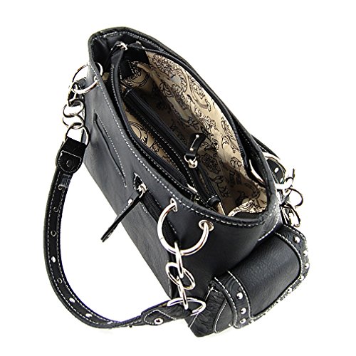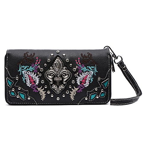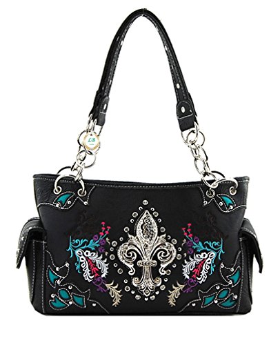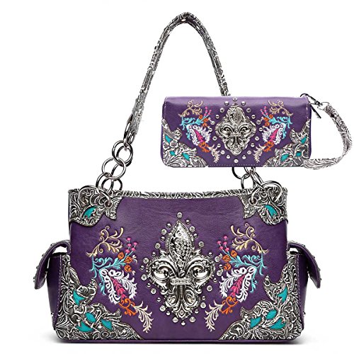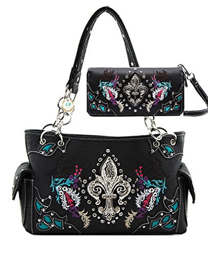 The western Fleur-De-Lis satchel bag is made with faux leather, with top zip and magnetic closure. Rhinestones buckle and metal studs embellishment. Two inside zip pockets. Two side pockets with magnetic closure. A small pocket and a zip pocket on the back. Four metal feet for bottom protection. The size is 13(L) by 8(H) by 5(W) inches (drop length 11 inches). The matching wallet is made with faux leather. Beautiful rhinestones and metal studs. Two zip closures. eight credit card slots, four bill pocket, and an inside zip pocket. The size is 8"L x 4.5"H x 1.5"W.Feature