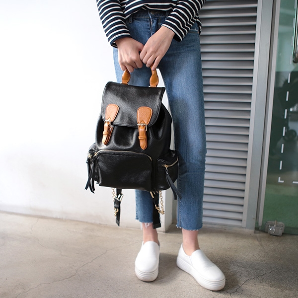 |  시크하면서도 스포티한 느낌의 백팩을 소개합니다! 소재자체가 무겁지 않아서 데일리 백으로 가볍게 스타일링하기 너무 좋은 가방으로 손잡이 부분과 버클라인에는 컬러 가죽배색으로 포인트와 밸런스를 맞춰 주었구요! 넉넉한 수납공간은 물론이고 가벼운 소재로 활동성까지 겸비한 제품이랍니다! 스터디용으로 사용하기에도 좋은 제품이고 여행용 가방으로도 추천해드리고 싶은 활용도 좋은 캐주얼한 백팩이예요! 다양한 코디에 어울리는 아이템으로 상세페이지 꼼꼼히 확인하시고 굿 초이스해주세요!       | COLOR | 블랙 | | 제품 색상은 모니터에 따라 실제 색상과 차이가 있을 수 있습니다. | | | | FABRIC | 합성피혁 | | | | PRODUCT ION | 제조국 / 중국 | | 품질보증기준 / 소비자분쟁 해결기준에 따름 | | A/S 책임자 및 고객센터 / 감성가방 | | | | SIZE INFO | 사이즈는 측정 방법에 따라 1~2cm의 차이가 있을 수 있습니다. | | 스트랩 길이는 연결 고리를 제외한 길이이며, 최대 길이입니다. | | (단위:cm, g) | | 가로 길이 | 세로 길이 | 너비 | 손잡이 높이 | 스트랩 길이 | 무게 | | 34 | 37 | 14 | - | 43(조절o) | 1980 |  |