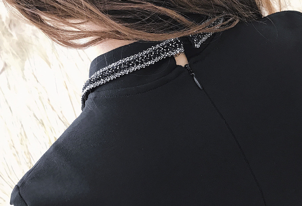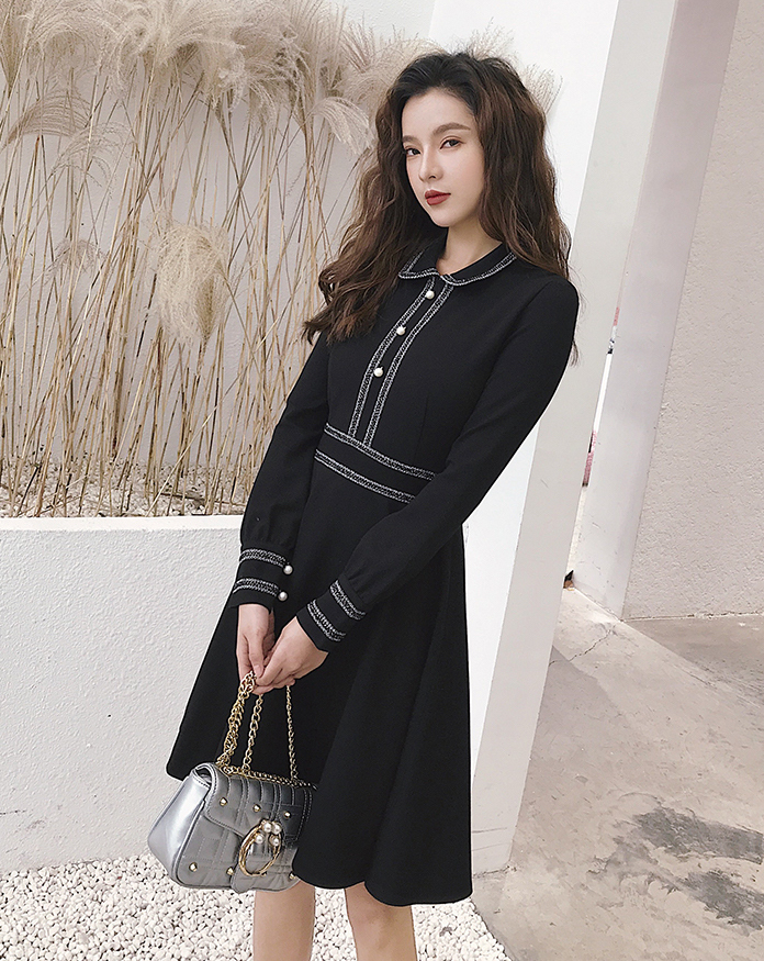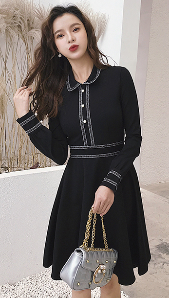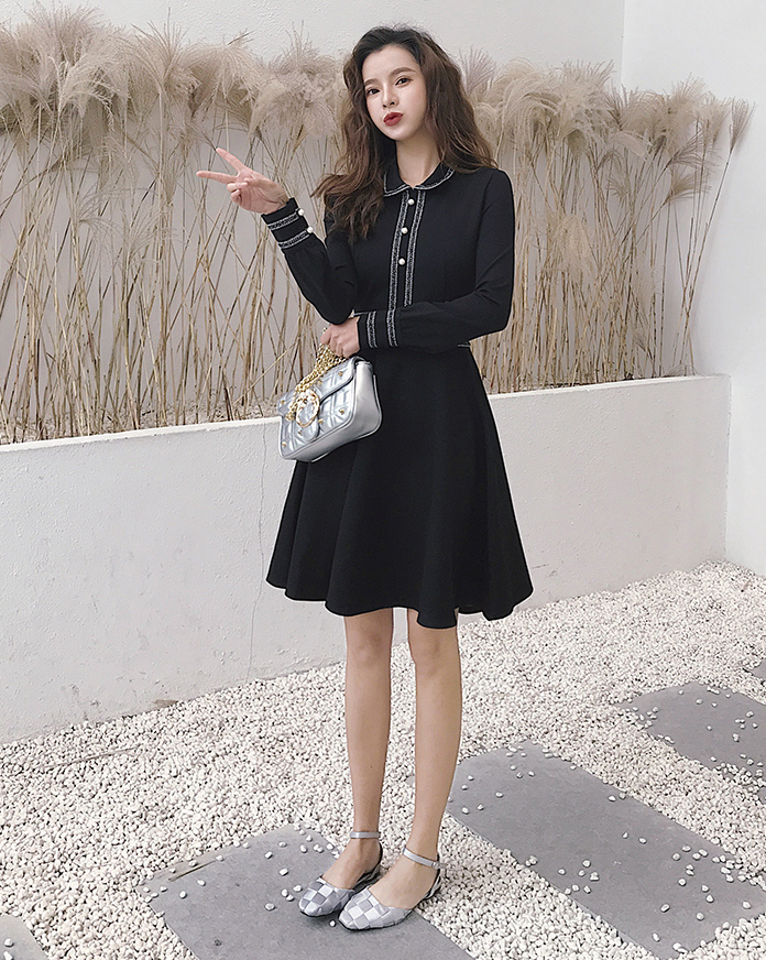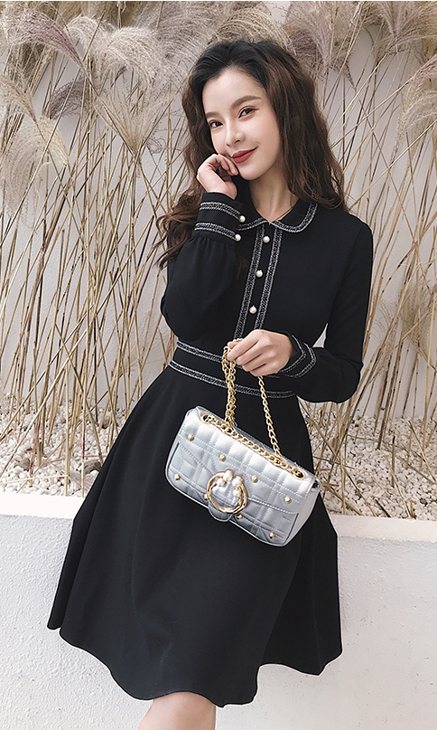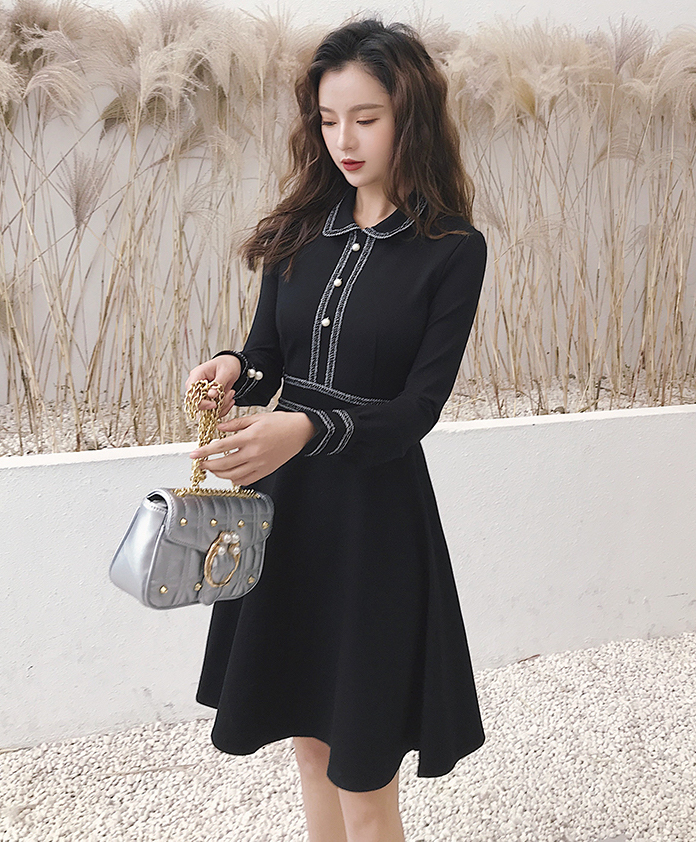 モノトーンが清楚で落ち着いた雰囲気の膝上丈フレアワンピースです。