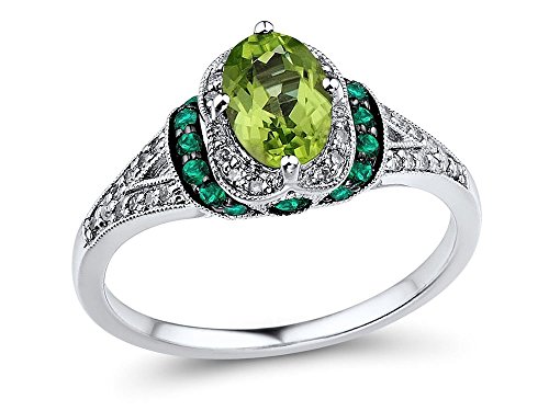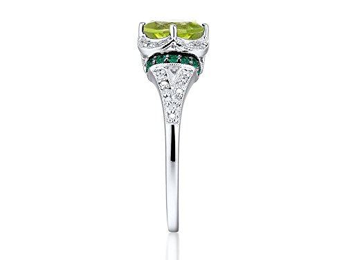 -. Feature : Beautiful Vintage Style Peridot Ring with Lovely Side View and Milgrain Trim / 7x5 Oval Shape Peridot (may be oiled) / 16 Round Lab Created Emeralds / 32 Round Diamond Accents, HI Color, I2-I3 Clarity / Rhodium Plated Sterling Silver