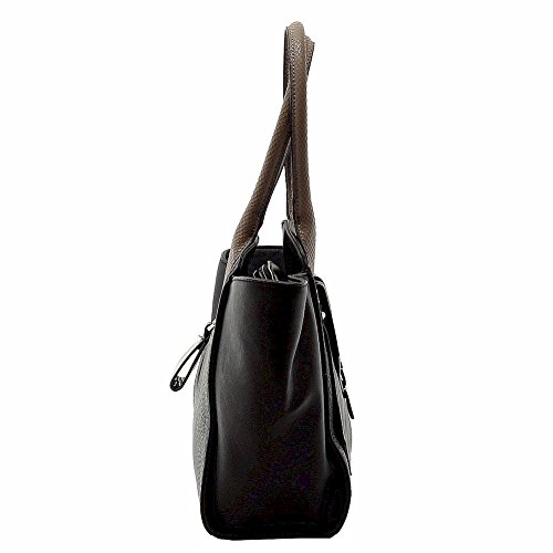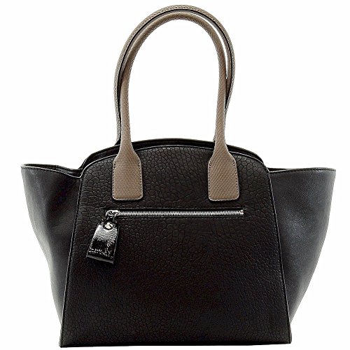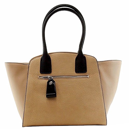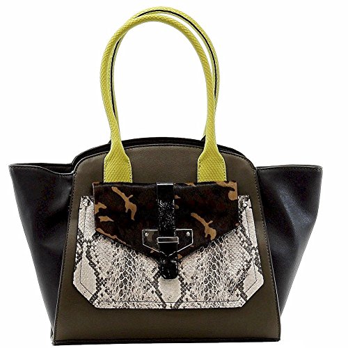 -. Feature : Faux-Leather Exterior With Embossed Python Detail / Top Zipper Closure / Front Exterior Flap Pocket & Back Exterior Zipper Pocket / Interior Zipper Pocket; Cell Phone Pocket & Two Additional Multipurpose Compartments / Double Top Handles With 8" Drop