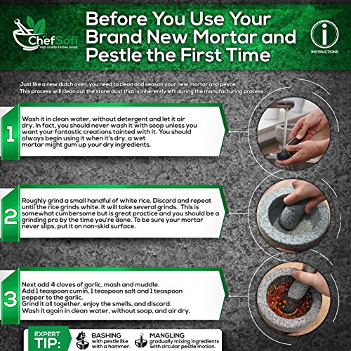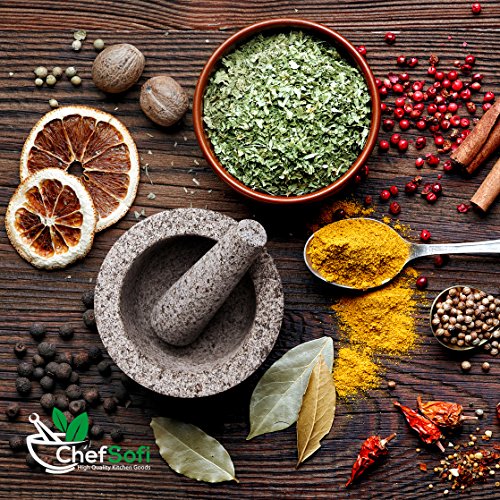 - ✔ EFFORTLESS USE: This ChefSofi™ stone cookware set was designed with your convenience in mind. Made from unpolished granite, you will waste no time fumbling or stabilizing your pestal, as our mortar’s cup interior provides the best, natural friction for swift cooking ingredient crushing, grinding or powdering. With a 500 ml (approx. 2 Cup) capacity, this stone bowl also reduces the need for ingredient refills, affording quick food prep, in one go!