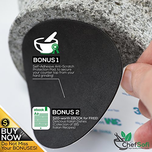 ChefSofi Mortar and Pestle Set - Unpolished Heavy Granite for Enhanced Performance and Organic Appearance - INCLUDED: Anti-Scratch Protector + Italian Recipes EBook - 6 Inch, 2 Cup-Capacity