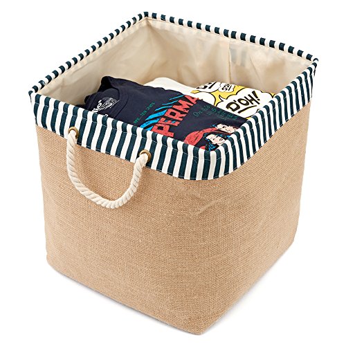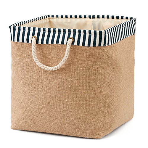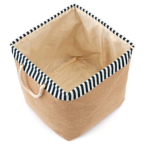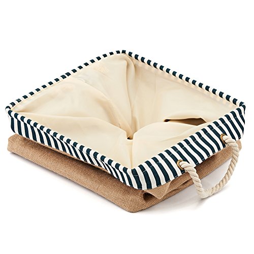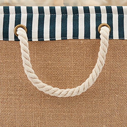 Folding Basket EZOWare Laundry Hamper Bucket Burlap Canvas Storage Container Bin For Office, Bedroom, Closet, Laundry, Toys & More - with Blue and White Trim