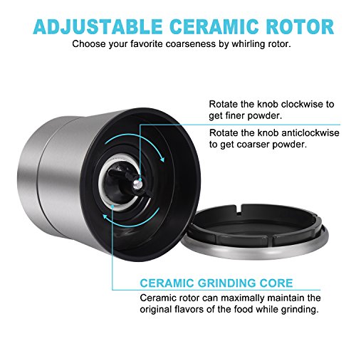 - 【Adjustable Coarseness】You can rotate the rotor on the top to choose your favorite powder coarseness . Easily grind the spices into fine, medium or coarse powder to sprinkle on your dish.