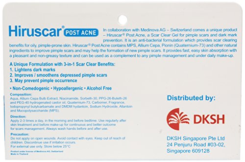 Studio : Chom Publisher : Chom Binding : Health and Beauty Product Description Hiruscar Postacne 3-in-1 Formulation : Hiruscar Postacne is a 100% anti-bacterial, clear gel which has been specially formulated for fast,easy skin absorption. The unique 3-in-1 formulation works simultaneously to improve the appearance of existing acne scars as well as prevent the formation of new permanent scars arising from acne. In Collaboration with Medinova Ag-Switzerland, Hiruscar Postacne is proven to improve depressed scars arising from acne and help lightens dark spots and/or red marks. In addition, it also reduces the amount of bacterial load on the skin, thus preventing bacterial from spreading and acne re-occurence. With its pleasant and non-greasy texture, it can be used s part of normal make-up and treatment regime. How it work : 1. Improves the appearance of depressed acne scars / The unique formulation speeds up skin regeneration (peeling effect) and stimulates blood flow to help new tissue regenerate. 2. Lightens any Dark spots and/or reduces redness after acne heals / Inhibits skin pigmentation. 3. Prevents the re-occurrence of acne / The anti-bacterial formulation works to help reduces the spreading of bacteria which can be lead to formation of new acne. How to use : After Clean your face, Rub cream all Face and Neck every day.Apply Hiruscar Postacne to effected areas at least 2-3 times daily. With its good absorption properties, Hiruscar Postacne can be used in conjunction with daily make-up and be part of your treatment regime. With continuous and recommended usage, the appearance of acne scars will be less visible within 4 weeks. 0