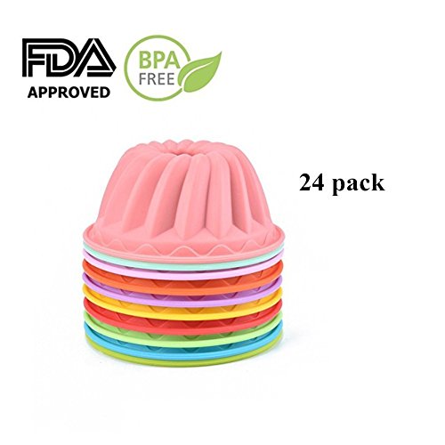 - 【Specifications and Dimensions】- Each Standard Size round individual mold measures 2.7 in. dia. (top) x 1.25 in. tall, and hole 1.8 in. dia. (bottom). Each 24 pack comes in multicolor, vibrant colors (pink, rose red, green, light green cream white and purple ect.), packaged in a durable, clear storage jar with a screw top lid. Temperature safe from -40 F to 500 F. Microwave, oven, refrigerator, freezer and dishwasher safe. They feature our SHareling technology to ensure optimum baking performanc