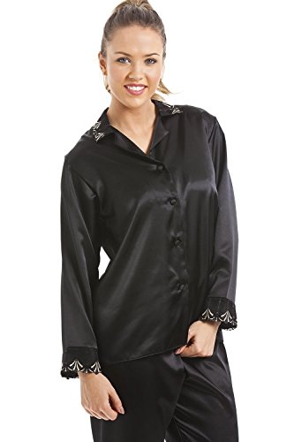 -. Feature : Luxus-Schlafanzug aus schwarzem Satin von Camille / Bezauberndes Satin-Oberteil mit Knopfleiste und schöner Stickerei in schwarz und gold / Lange Schlafanzughose mit elastischem Bund / Auch in anderen Farben erhältlich / HERGESTELLT IN GROSSBRITANNIEN