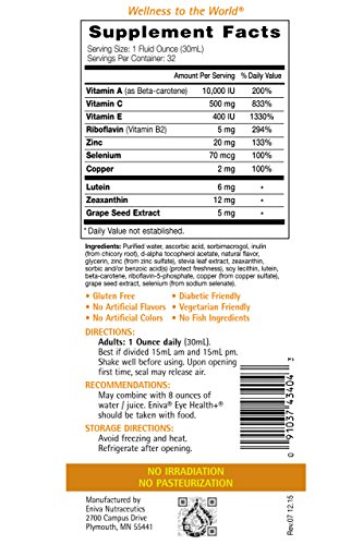 A Specialized Formula:Lutein: A subgroup of the carotenoid family that acts as a filter for the light sensitive photoreceptor cells in the macula of the eye.*Zeaxanthin: A member of the carotenoid family that is a macular light-gathering pigment which aids in the processing of free radicals from ultra-violet radiation and oxygen.*Vitamin A (as beta-carotene): Supports the production of visual purple (substance necessary for seeing at night) and acts as an important vitamin catalyst and antioxidant.* Vitamin B2: Supports health of the eye through the release of glutathione (shields the proteins in the lens of the eye).*Vitamin C: A nutrient vital for the production of aqueous humor (fluid between the cornea and lens) and the reformation of corneas.*Vitamin E: A potent antioxidant that helps quench free radicals in the retina and supports circulation and tissue health.*Zinc: Catalyst for conversion of vitamin A to its active form retinaldehyde in the retina.Selenium & Grape Seed Extract: Acts as a potent antioxidant that scavenges free radicals to promote retinal and macular health.*Copper: Supports formation of strong, flexible connective tissue for proper eye structure.*The advanced liquid formula of Eniva Eye Health+ aid in quicker absorption and use of ingredients than tablets or pills which must first dissolve in the digestive system before being absorbed.*It is normal and expected with natural extracts and ingredients some settling may occur.Aqueous Stabilization: Eniva's liquid proprietary nutrient stabilization process.Ingredients: Purified water, ascorbic acid, sorbimacrogol, inulin (from chicory root), d-alpha tocopherol acetate, natural flavor, glycerin, zinc (from zinc sulfate), stevia leaf extract, zeaxanthin, sorbic and/or benzoic acid(s) (protect freshness), soy lecithin, lutein, beta-carotene, riboflavin-5-phosphate, copper (from copper sulfate), grape seed extract, selenium (from sodium selenate).Feature