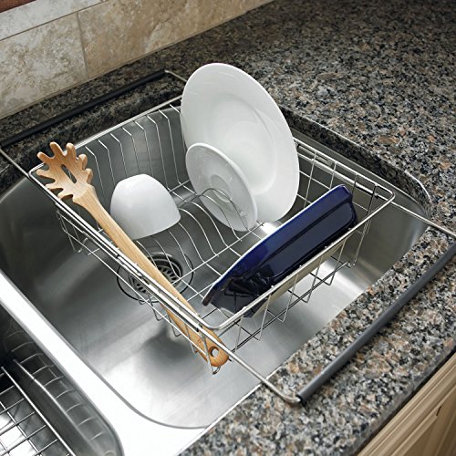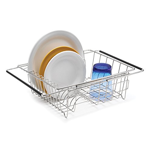 -. Feature : Balances over sinks up to 27.5" wide to dry dishes / In-sink design frees up counters and drains directly into the sink / Rests on rubber-coated extendable arms or on four rubber-coated feet / Rust-proof stainless steel / Measures 13.75" x 11.5" x 5" when closed