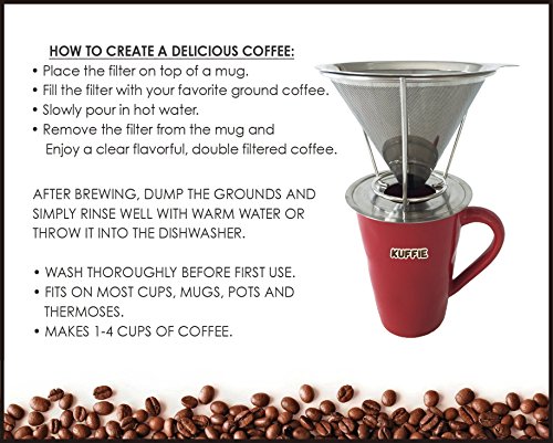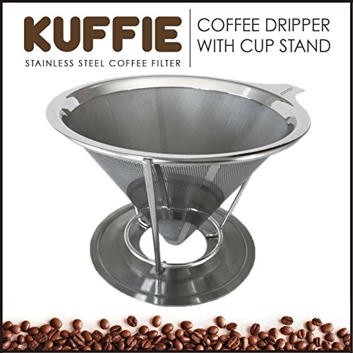 -. Brand : Kuffie -. Color : Stainless Steel -. Feature : INNOVATIVE DESIGN - Modern and minimalistic look with superb finishings. Made from 304 stainless steel that will keep it rust free and deliver a clean tasting coffee. Designed to fit on most cups, mugs, thermoses and small pots. / COOL TO THE TOUCH - The paperless coffee cone stays cool to the touch, allowing you to grab by the tab without burning your fingers. Unlike other stainless steel coffee filters, ours is a true 4 cup coffee maker and brewer. / DOUBLE FILTERED - The pour over coffee dripper cone has an ultra fine mesh on the inside, and a laser-cut filter on the outside. Engineered to prevent any grounds from getting in your coffee, while allowing essential oils and nutrients to pass through to your cup, ensuring a healthier and better tasting cup of coffee. / DURABLE - Made from premium kitchen grade 18/8 stainless steel that is BPA and Phthalate Free. The reusable coffee filter is so versatile, that you can take it on the go allowing you to prepare from a single cup of coffee at a time or a small pot for 4+ people. / LIFETIME SATISFACTION GUARANTEE - If at any point you are unhappy with your KUFFIE Pour Over Coffee Dripper you can return it for a full money back refund. Customer service is our #1 priority. -. Label : Howloo -. Manufacturer : Howloo -. Model : Coffee Dripper -. PackageQuantity : 1 -. ProductGroup : Kitchen -. ProductTypeName : KITCHEN -. Publisher : Howloo -. Studio : Howloo -. Title : KUFFIE Stainless Steel Coffee Filter - Permanent, Reusable and Paperless Pour Over Coffee Dripper Cone (4 Cup Coffee Maker and Brewer)