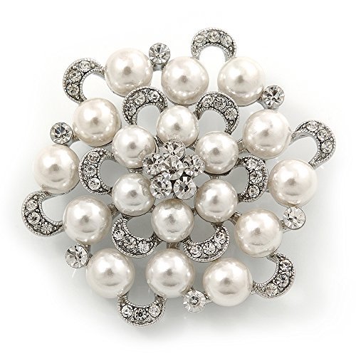-. Title : Bridal Glass Pearl, Clear Crystal Flower Brooch In Rhodium Plating - 45mm D