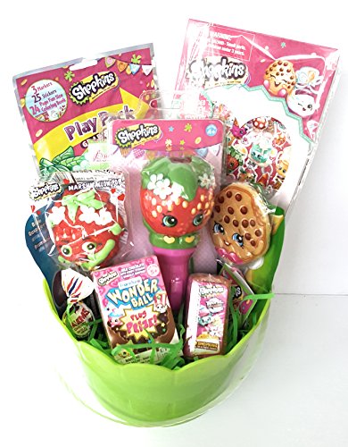 -. Feature : Shopkins Flashlight, Puffy Stickers, Grab N Go Play Pack, World Vacation / Shopkins Wonder Ball (Plus SurP.R.Ise), Lollipop, Marshmellow Pop / Chocolate Bunny, Sugar Pack Laffy Taffy, Pixy Stix, Blow Pop Hubba Bubba / Comes assembled and ready to gift!! Green Easter Grass
