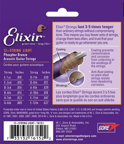 Studio : W.L. Gore Associates (Elixir Strings) Publisher : W.L. Gore Associates (Elixir Strings) Binding : Electronics Product Description Elixir Strings Acoustic Phosphor Bronze with NANOWEB Coating deliver distinctive phosphor bronze warmth and sparkle together with extended tone life that players have come to expect from Elixir Strings. The #1 acoustic guitar string (MI SalesTrak (US $ Vol)), Elixir Strings, provide consistent performance, smooth feel and reduce finger squeak. With less hassle and expense of frequent string changes, you enjoy more time making music. From the stadiums to the street, Elixir Strings players tell us their tone lasts longer than any other string, uncoated or coated. While other phosphor bronze strings lose their mojo fast due to dirt and debris, Elixir Strings is the only coated string brand to protect the entire string with an ultra-thin coating, keeping gunk out of the gaps between the windings. The Anti-Rust Plated Plain Steel Strings also resists tone-deadening corrosion, ensuring longer life for the entire set. 12-String Light Gauge: 010 014 023 030 039 047 010 014 009 012 018 027. Other Gauges Available Include: Extra Light: 010 014 023 030 039 047; Custom Light: 011 015 022 032 042 052; Light: 012 016 024 032 042 053; Light-Medium: 012 016 024 035 045 056; HD Light: 013 017 025 032 042 053. Elixir Strings wound and Anti-Rust Plated Plain Steels are available as single strings in a range of gauges. 0