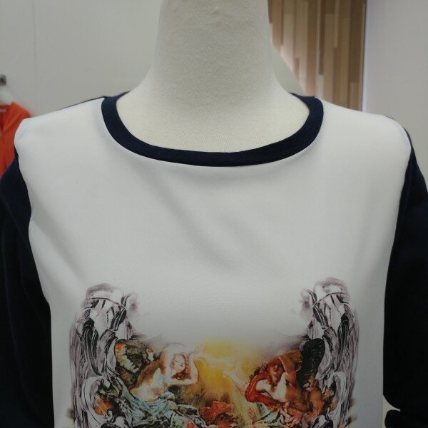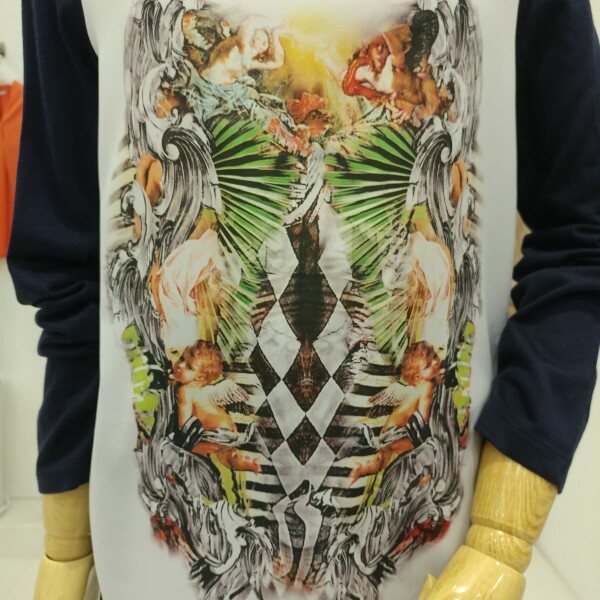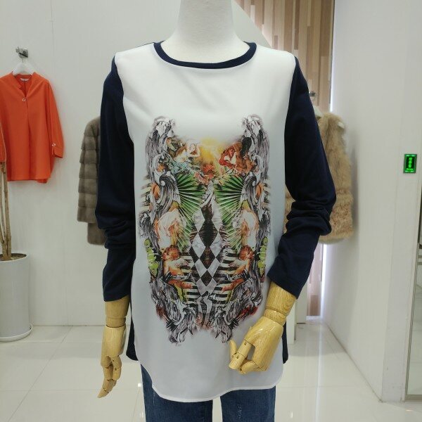 평소 편하게 착용하실수있는 프린트티셔츠로 앞은 얇은 폴리소재고 뒤는 레이온혼방소재로 시원하게 착용하실수있는