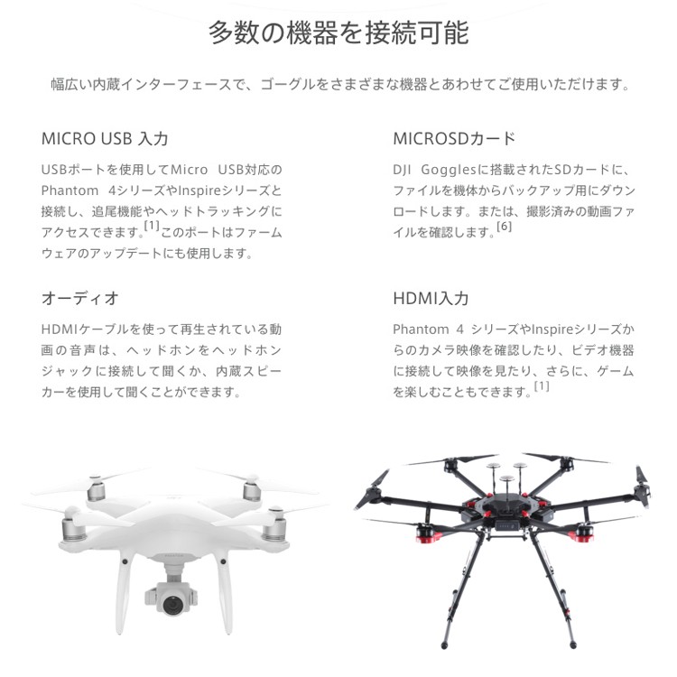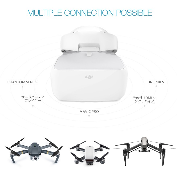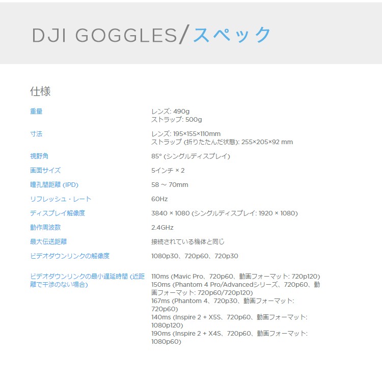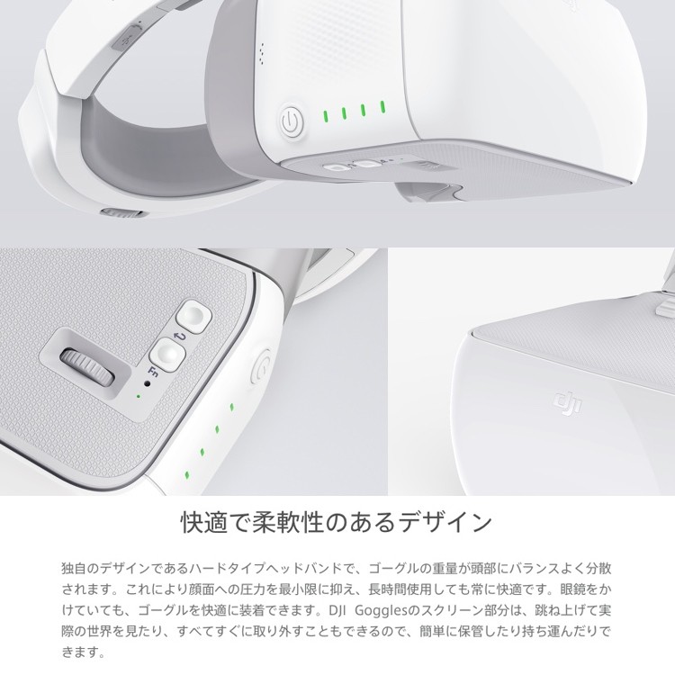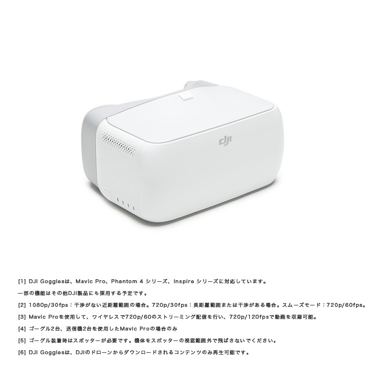 | 商品説明 | ■DJI Gogglesは、DJI 製品によるFPV 飛行の映像をシームレスに 伝送するために設計された、快適なゴーグルです。 超高品質大型ペアスクリーン、長距離で低遅延なワイヤレス伝送と、 映像の明るさやシャープネスの調整を含む写真や動画撮影の ダイレクトコントロールを組み合わせたゴーグルです。 ActiveTrack (アクティブトラック)モード、 TapFly (タップフライ)モード、地形フォローモード、 トライポットモードといったインテリジェント・フライトモードで、 まったく新しい次元の飛行体験を実現します。 ■低遅延伝送 DJI Goggles は、720p/60fpsの動画伝送と1080p/30fpsの短距離動画伝送を、 わずか110msという非常に低遅延で実現します DJIのOcuSync ワイヤレス伝送システムを使用して、 最大4台の機器を同時にMavic Pro に接続できます ヘッドバンドに内蔵されているアンテナは、360°の範囲を 確実にカバーできるため、機体が自分の後ろを飛んでいたとしても、 信頼性の高い接続を確立します。 飛行をしながら友達に空からの俯瞰映像を見せて、 没入感のある飛行の楽しさを共有しましょう。 高解像度 DJI Gogglesは2つの1920x1080のスクリーンを搭載しているため、 標準的な単一の2Kスクリーンの2倍以上の画素数を実現しています。 (標準的なゴーグルの「2K」スクリーンは、左右それぞれの目に対応し、 2つの1280x1440のセクションに分割されています。 16:9の映像を見る場合、一部のセクションはさらに切り取られ、利用可能画素数の4分の1しか残っていません。) スクリーンの解像度が高いので、高精彩でクリーンな映像を楽しむことができます。 DJI Gogglesは連続で最大6時間使用可能です。 光学設計 DJI Gogglesは、ビームスプリッターを使用して左右の目の前に映像を表示します。 また、偏光の特性を利用して映像の重なりを防ぎます。 これにより、片目ごとに1920x1080のフルHD解像度の映像を生み出すことができます。 ゴーグルの大口径非球面レンズを併用すると、 片目ごとに85°の視野が生まれ、没入感を最大化します。 ヘッドトラッキング[1] 頭の動きで機体のヨーとカメラのチルトをコントロール (-90°、+30°)できます。 これは、送信機のコントロールスティックと同じです。 左か右に旋回するには、頭を左か右に回すだけです。 旋回を停止させるには、頭を真っすぐにしてください。 モーションコントロール・ジンバルモードでは、ヨーに影響をおよぼすことなく、ジンバルだけが動きます。 タッチパッドと送信機[1] DJI Gogglesに内蔵されているタッチパッドか、 Mavic Proの送信機にある5Dボタンで、主要なインテリジェント機能に アクセスできるので、内部のメニューシステムの操作が容易に、そして直感的におこなえます。 インテリジェントフライト[1] DJI Gogglesは、まったく新しい飛行方法である固定翼モードを可能にします。 このモードでは、機体は左右に回転しませんが、十分な回転運動で前進し、 現実に近いフライトシミュレーションが行えます。ヘッドトラッキングモードと組み合わせて、 頭を動かしてMavic Proを操作し、存分に飛行体験を味わうことができます。 固定翼モードのAR軌道予測機能で、複雑な環境下でもより安全にこのモードを使用できます。 その他のインテリジェント・フライトモードには、地形フォローモード、 ActiveTrack (アクティブトラック)モード、TapFly (タップフライ)モード、シネマティックモード、トライポッドモードがあります。 快適で柔軟性のあるデザイン 独自のデザインであるハードタイプヘッドバンドで、ゴーグルの重量が頭部にバランスよく分散されます。 これにより顔面への圧力を最小限に抑え、長時間使用しても常に快適です。 眼鏡をかけていても、ゴーグルを快適に装着できます。 DJI Gogglesのスクリーン部分は、跳ね上げて実際の世界を見たり、すべてすぐに取り外すこともできるので、 簡単に保管したり持ち運んだりできます。 多数の機器を接続可能 幅広い内蔵インターフェースで、ゴーグルをさまざまな機器とあわせてご使用いただけます。 Micro USB 入力 USBポートを使用してMicro USB対応のPhantom 4シリーズやInspireシリーズと接続し、 追尾機能やヘッドトラッキングにアクセスできます。[1] このポートはファームウェアのアップデートにも使用します。 microSDカード DJI Gogglesに搭載されたSDカードに、ファイルを機体からバックアップ用にダウンロードします。 または、撮影済みの動画ファイルを確認します。[6] HDMI入力 Phantom 4 シリーズやInspire シリーズからのカメラ映像を確認したり、 ビデオ機器に接続して映像を見たり、さらに、ゲームを楽しむこともできます。[1] オーディオ HDMIケーブルを使って再生されている動画の音声は、 ヘッドホンをヘッドホンジャックに接続して聞くか、内蔵スピーカーを使用して聞くことができます。 [1] DJI Gogglesは、Mavic Pro、Phantom 4 シリーズ、Inspire シリーズに対応しています。 一部の機能はその他DJI製品にも採用する予定です。 [