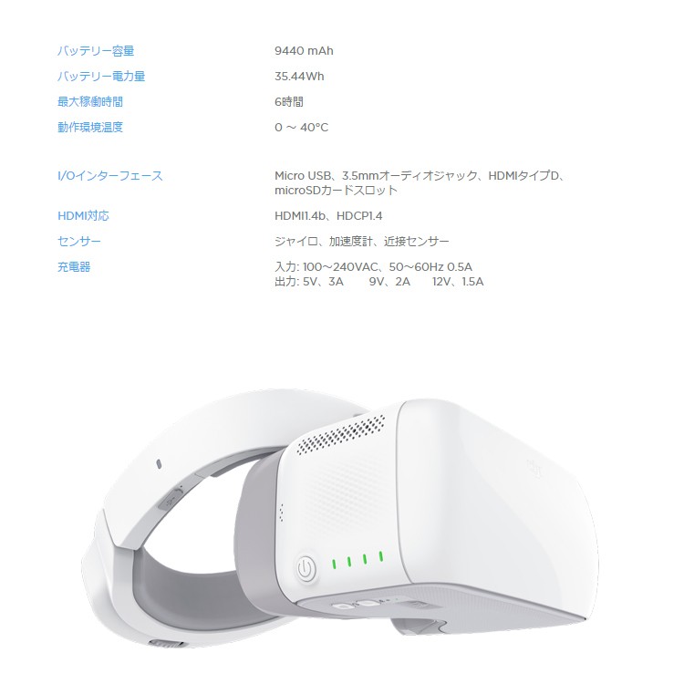| スペック | 重量 レンズ: 490g ストラップ: 500g 寸法 レンズ: 195×155×110mm ストラップ (折りたたんだ状態): 255×205×92 mm 視野角 85° (シングルディスプレイ) 画面サイズ 5インチ × 2 瞳孔間距離 (IPD) 58 ~ 70mm リフレッシュ・レート 60Hz ディスプレイ解像度 3840 × 1080 (シングルディスプレイ: 1920 × 1080) 動作周波数 2.4GHz 最大伝送距離 接続されている機体と同じ ビデオダウンリンクの解像度 1080p30、720p60、720p30 ビデオダウンリンクの最小遅延時間 (近距離で干渉のない場合) 110ms (Mavic Pro、720p60、動画フォーマット: 720p120) 150ms (Phantom 4 Pro/Advancedシリーズ、720p60、動画フォーマット: 720p60/720p120) 167ms (Phantom 4、720p30、動画フォーマット: 720p60) 140ms (Inspire 2 + X5S、720p60、動画フォーマット: 1080p120) 190ms (Inspire 2 + X4S、720p60、動画フォーマット: 1080p60) バッテリー容量 9440 mAh バッテリー電力量 35.44Wh 最大稼働時間 6時間 動作環境温度 0 ~ 40°C I/Oインターフェース Micro USB、3.5mmオーディオジャック、HDMIタイプD、microSDカードスロット HDMI対応 HDMI1.4b、HDCP1.4 センサー ジャイロ、加速度計、近接センサー 充電器 入力: 100~240VAC、50~60Hz 0.5A 出力: 5V、3A 9V、2A 12V、1.5A アプリ 名称 DJI GO 4 モバイルデバイスシステム要件 iOS 9.0、 Android 4.4.0以後のバージョンが必要です 対応モバイルデバイス iOS:iPhone 5s, iPhone SE, iPhone 6, iPhone 6 Plus, iPhone 6s, iPhone 6s Plus, iPhone 7, iPhone 7 Plus, iPad Air, iPad Air Wi-Fi + Cellular, iPad mini 2, iPad mini 2 Wi-Fi + Cellular, iPad Air 2, iPad Air 2 Wi-Fi + Cellular, iPad mini 3, iPad mini 3 Wi-Fi + Cellular, iPad mini 4 and iPad mini 4 Wi-Fi + Cellular. This app is optimized for iPhone 7, iPhone 7 Plus. Android:Samsung tabs 705c, Samsung S6, Samsung S5, Samsung NOTE4, Samsung NOTE3, Google Nexus 6p, Nexus 9, Google Nexus 7 II, Ascend Mate7, Huawei P8 Max, Huawei Mate 8, LG V20, Nubia Z7 mini, Sony Xperia Z3, MI 3, MI PAD, Smartisan T1. *Support for additional devices available as testing and development continues. |