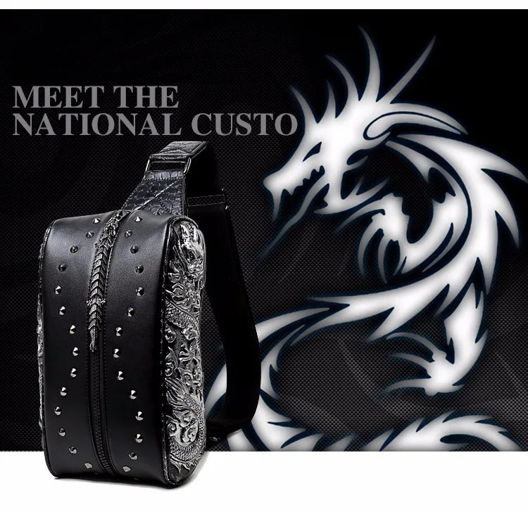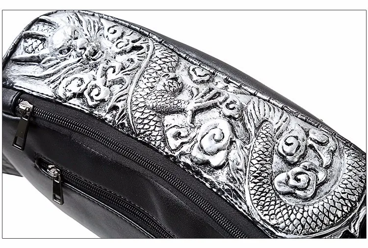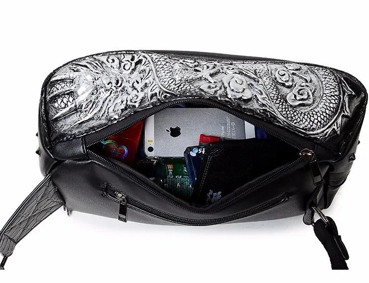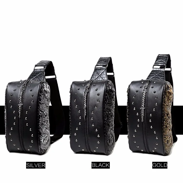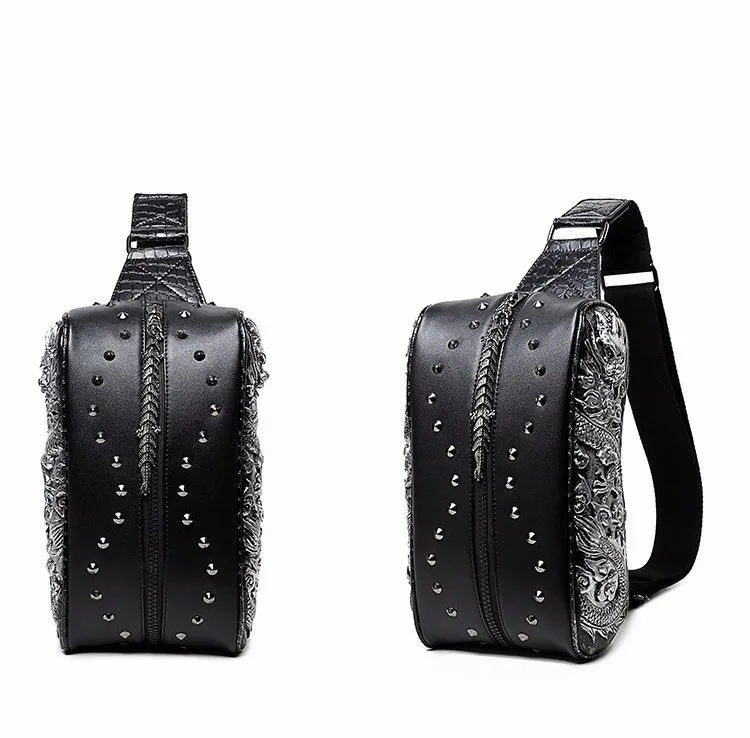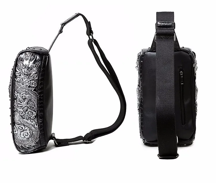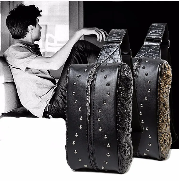 ホット販売3dドラゴンデザインウエストパックファッションリベット胸バッグpuレザー男のバッグヴィンテージ良い品質レザーバッグ