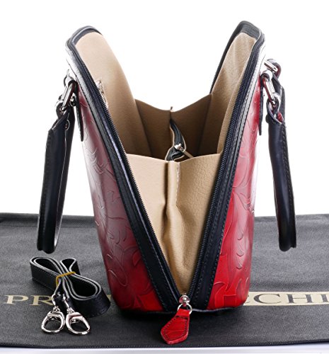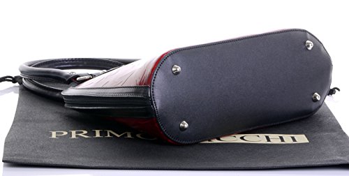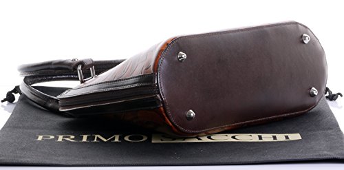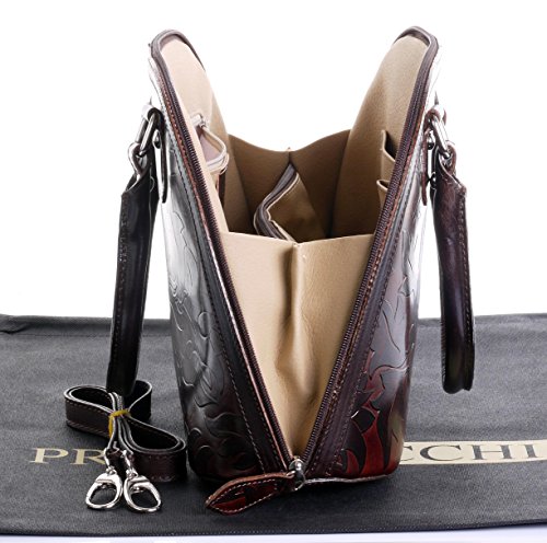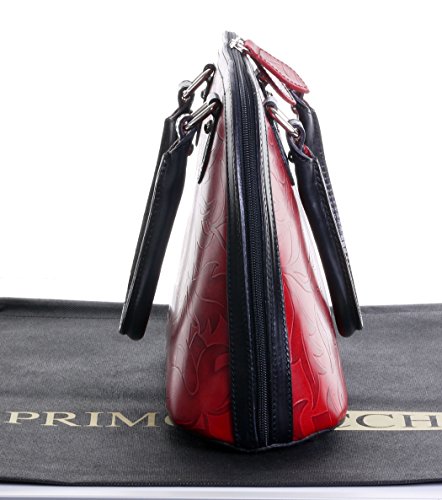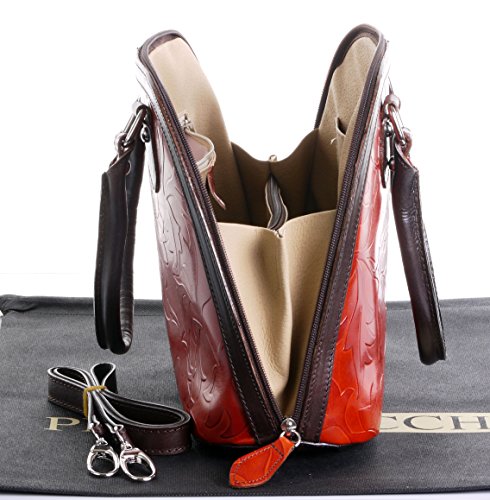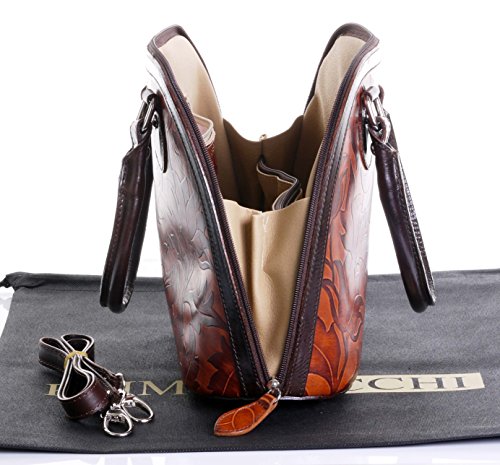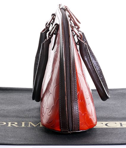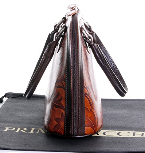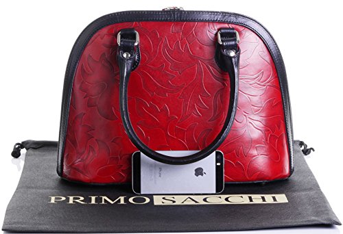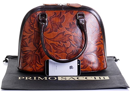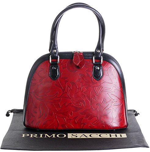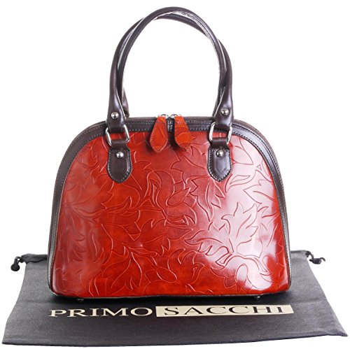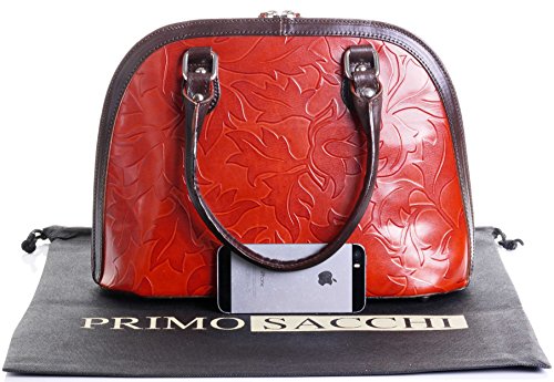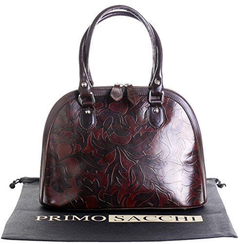 Product Description This leaf design, embossed, smooth leather structured bowling style bag bag is made in Florence from high quality Italian leather. The main compartment is secured by a large base to base zip, making access very easy, there are gusseted sides, to make sure what is inside stays there when open. Inside, there are two main compartments that are separated by a centre zipped compartment, a zipped pocket in the lining and two vanity pockets, so plenty of space for most ladies.