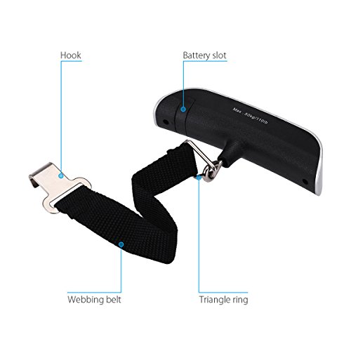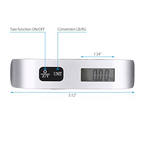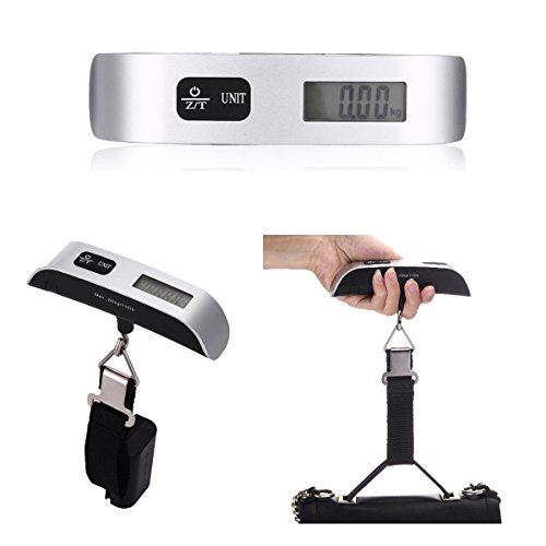 Product Description1. Color: Silver 2. Material: ABS, Electronic Components 3. Battery: 1x 3V CR2032 Lithium Cell 4. Button: Z/T UNIT botton 5. Max Weight: 50kg/110 lbs 6. Accuracy: 10g / 0.02lb 7. Size: approx. 5.07" x 11.6 inch Package Included 1 X 50Kg Electronic Travel Hanging Luggage Scale0