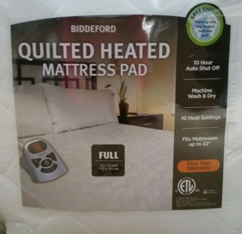 -. Color : white -. EAN : 0657812150852 -. Feature : Biddeford Full Size Quilted Heated Mattress Bed Pad White 54"x 75", Biddeford Heated Mattress Pad. Full SIZE. Single Digital Control with 10 Warming Settings and 10 Hour Auto Shut Off. Fits mattresses up to 22 inches deep. Provides all season mattress protection. QUILTED, top 2 layers are 50% Cotton, 50% Polyester, bottom 100% polyester. Perfect temperature every night ... with this heated mattress pad. Easy To Set control allows you to maintain a constant temperature. Machine wash & dry. -. Label : Biddeford -. Manufacturer : Biddeford -. ProductGroup : Single Detail Page Misc -. ProductTypeName : MISC_OTHER -. Publisher : Biddeford -. Size : full -. Studio : Biddeford -. Title : Biddeford Full Size Quilted Heated Mattress Bed Pad White 54"x 75" Single Digital Controller -. UPC : 657812150852
