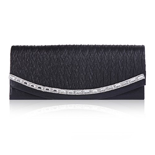 The evening clutch features sparkling rhinestone?and has a structured shape with a pleated flap front design and a secure snap closure