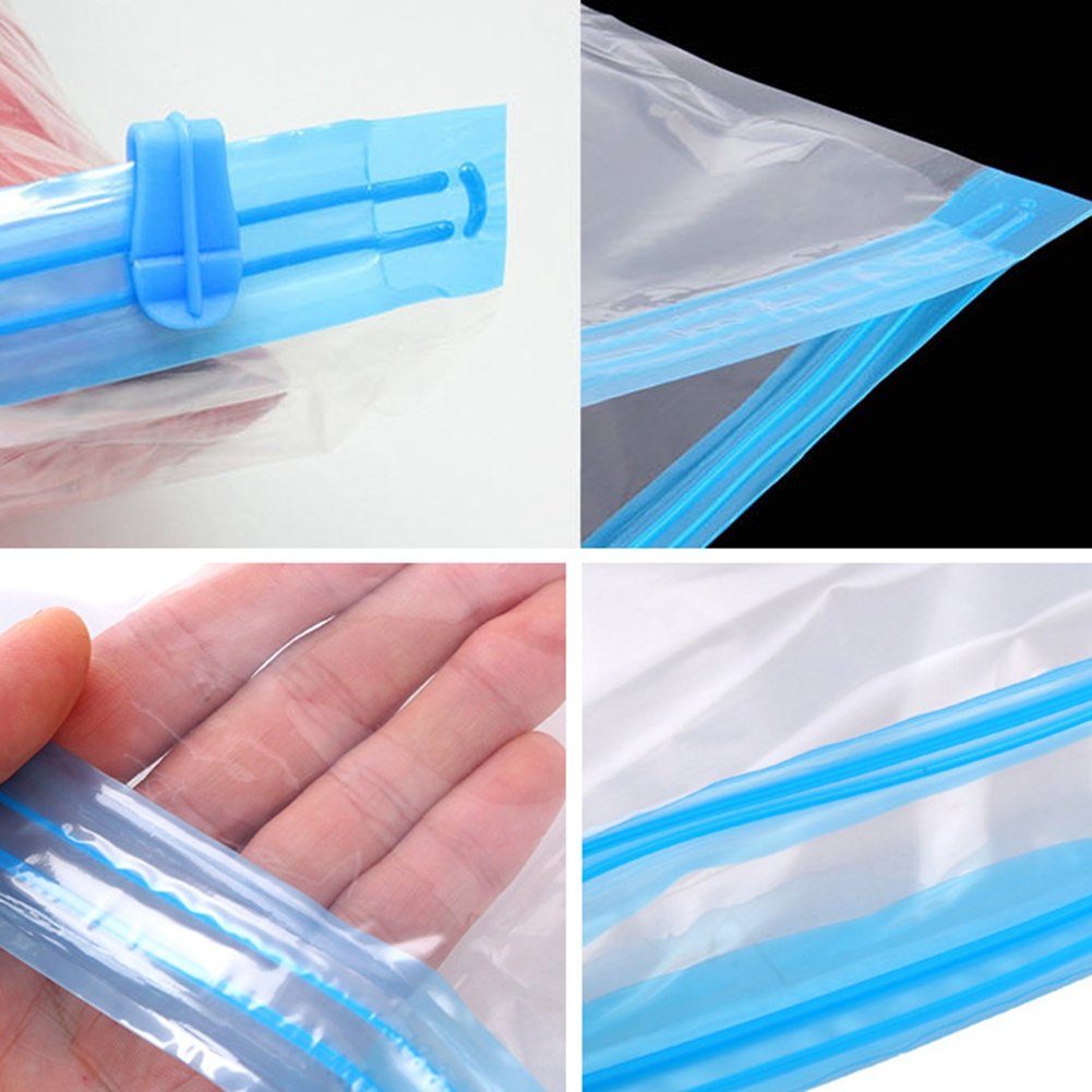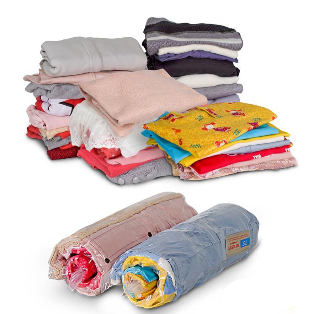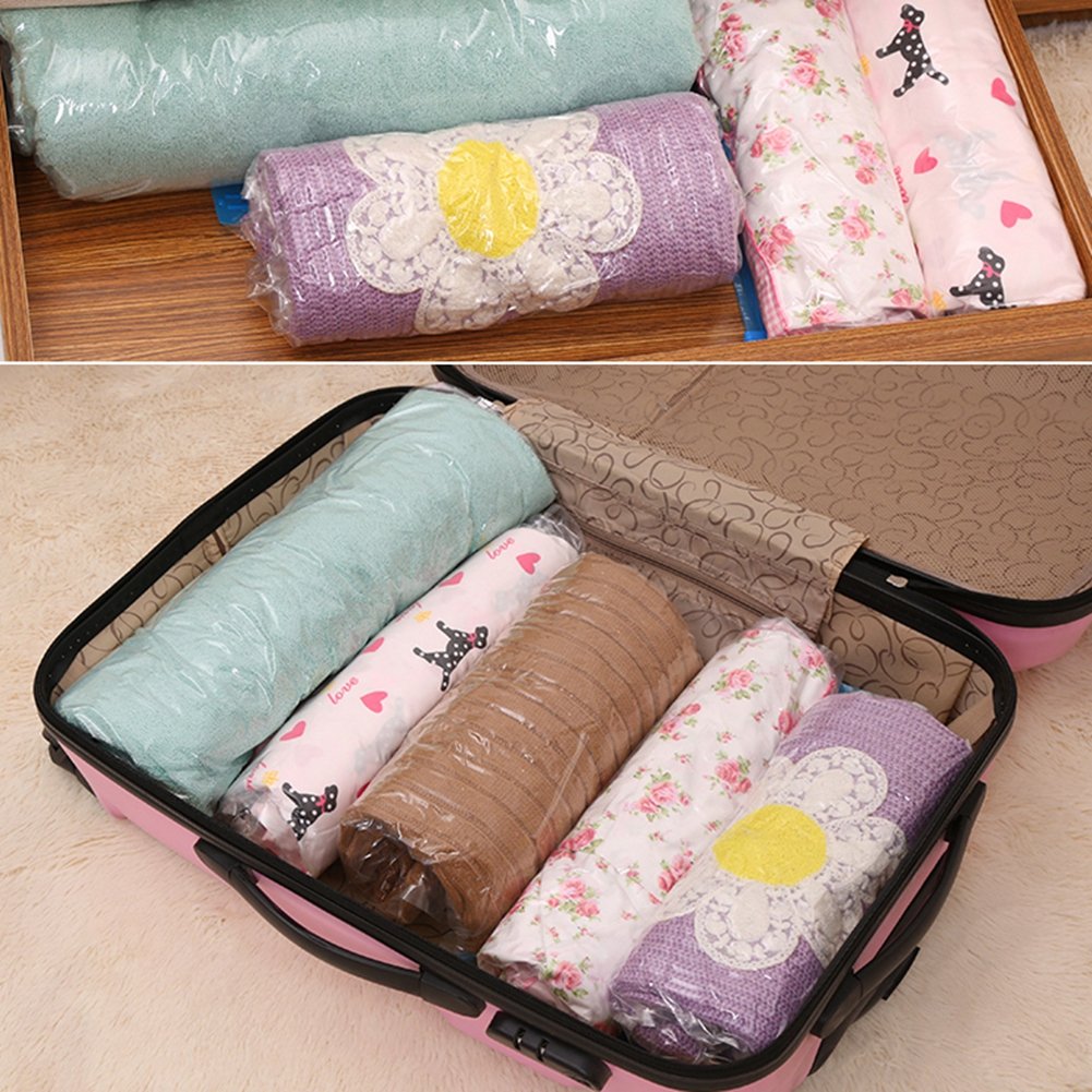 Easy storage No need for a vacuum cleaner, rolled by hand Just rolling round, air escapes, speed clothing compressed to about 1/2! Can be used repeatedly Compact luggage while traveling, easy to distinguish with transparent compression bags,