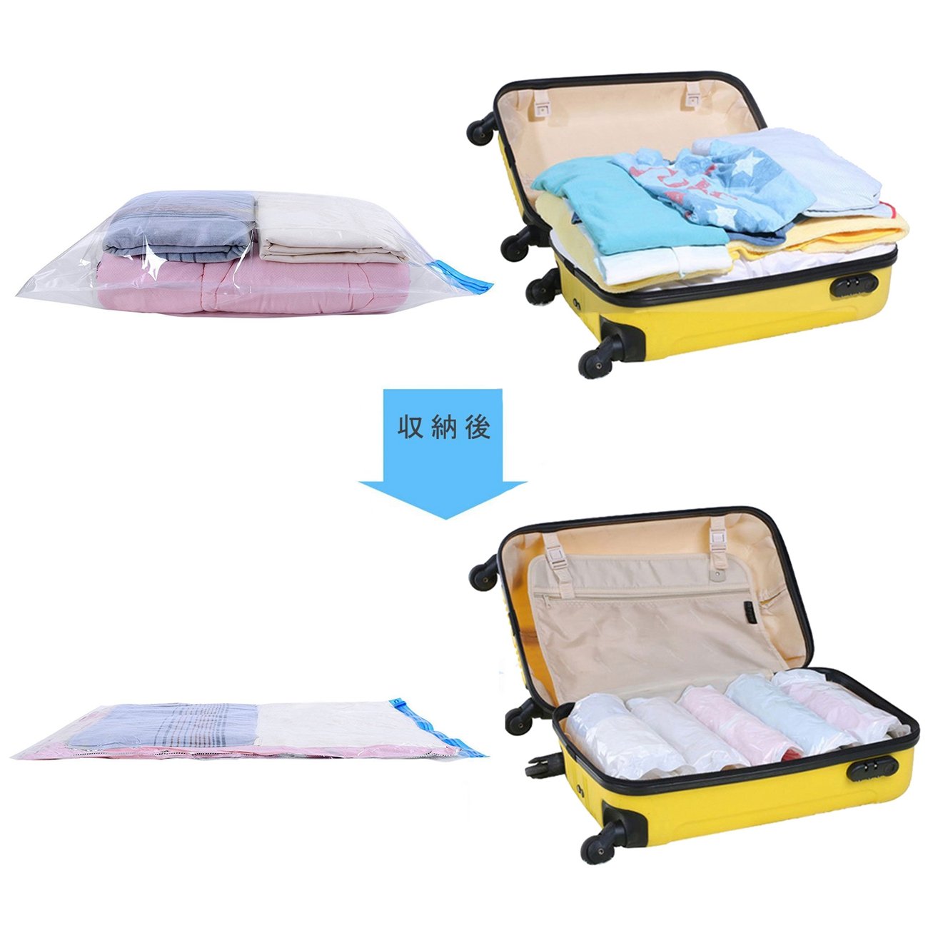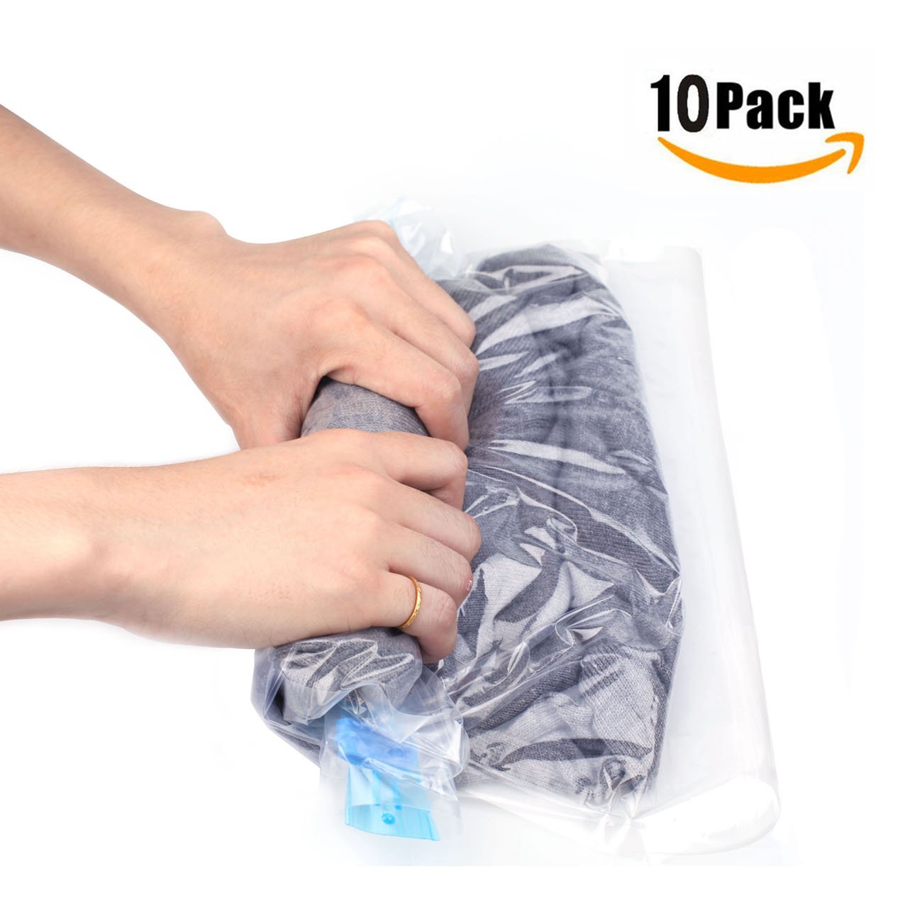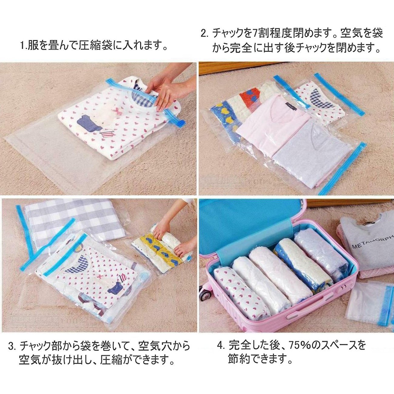 Easy storage No need for a vacuum cleaner, rolled by hand Just rolling round, air escapes, speed clothing compressed to about 1/2! Can be used repeatedly Compact luggage while traveling, easy to distinguish with transparent compression bags,