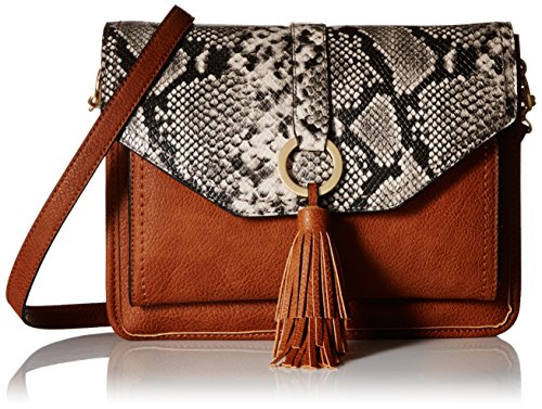 Rectangular cross-body bag in faux leather featuring snakeskin-embossed flap and gold-tone ring hardware with tassel