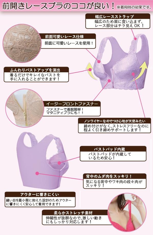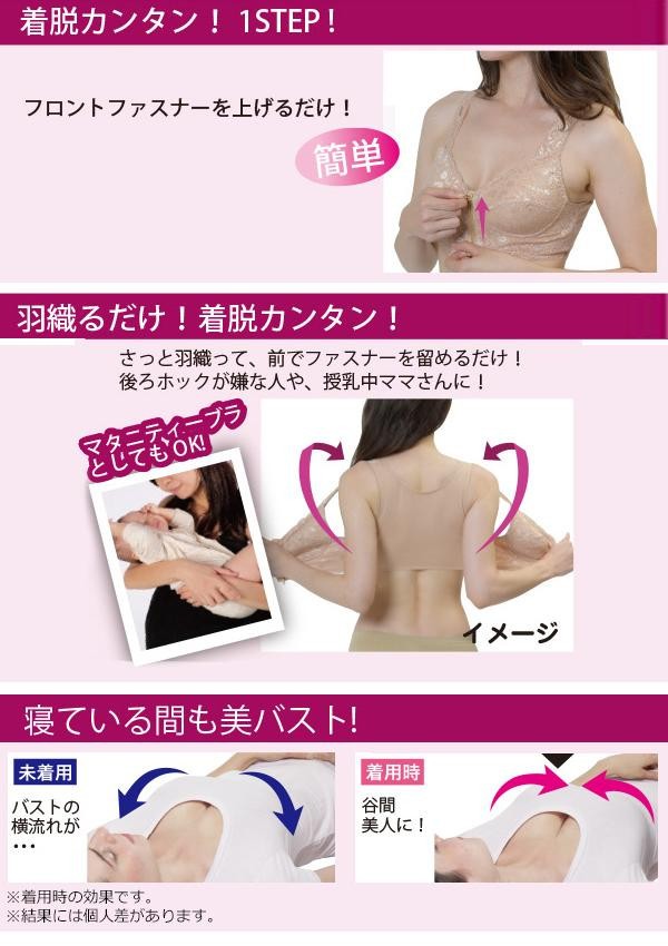 | さっと羽織って、前でファスナーを留めるだけ!!後ろホックが嫌な方はもちろん、マタニティーブラとしても使えるので授乳中のママにもおすすめです。 |