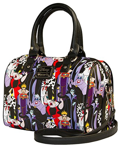 The top five most evil female Disney villains all come together on this shoulder bag. All-over print featuring Queen Grimhilde, otherwise known as The Evil Queen from Snow White and the Seven Dwarves, Cruella De Vil from One Hundred and One Dalmatians, Maleficent from Sleeping Beauty, Ursula from the Little Mermaid and the Queen of Hearts from Alice in Wonderland. Made of black soft vegan faux leather. This is a boutique quality handbag with lots of great detailing. Inside contains one large zip pocket and two open side pockets. Fully lined and measures 10 inches wide, 9 inches high, 7 inch depth. 5 inch handle drop. Adjustable and detachable crossbody long straps. Vegan friendly!Feature