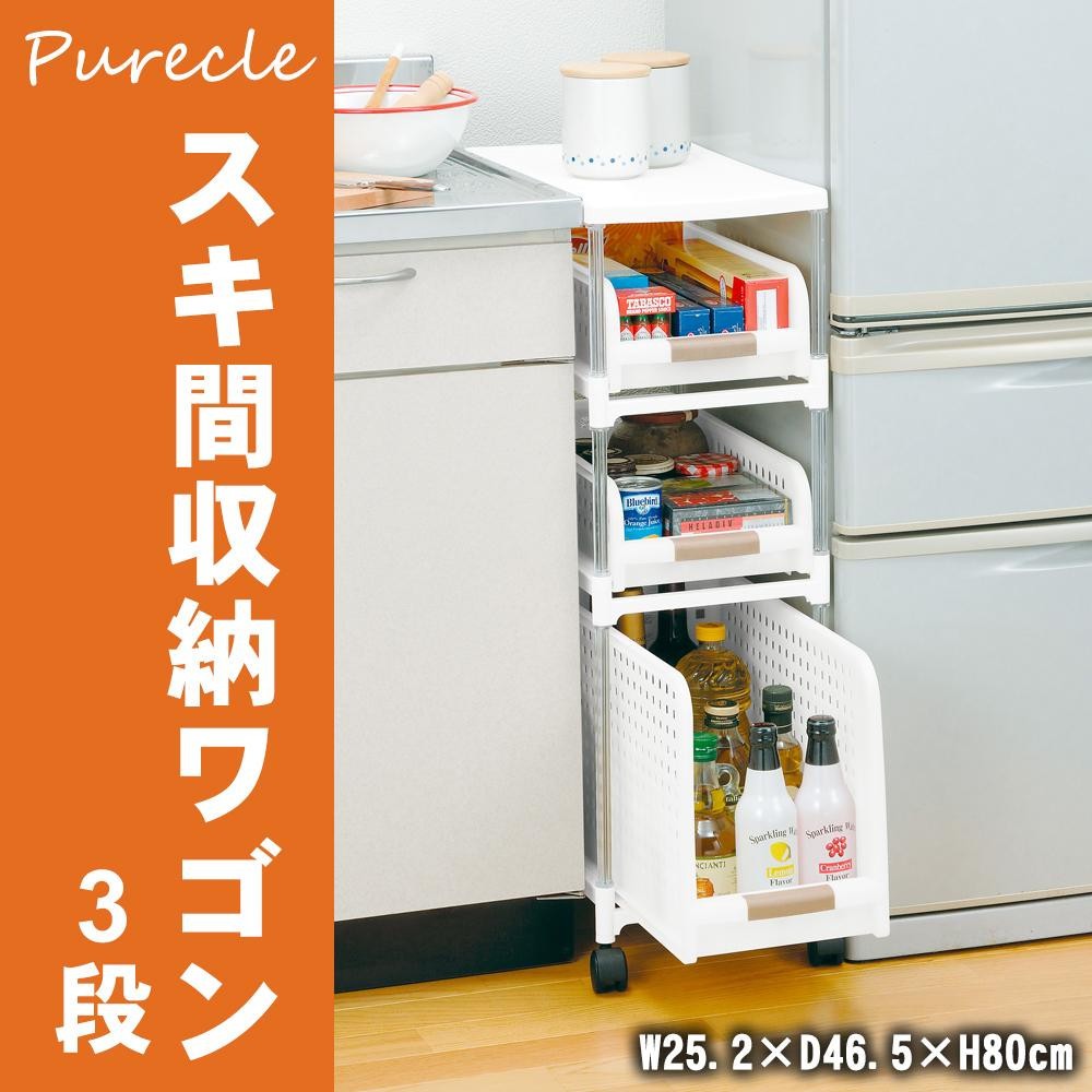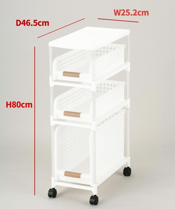 | ちょっとしたすき間が収納スペースになります。1段1段スライド式なので奥の物を取り出しやすく、四隅にキャスターが付いているので移動もラクラク♪ |