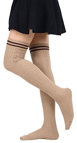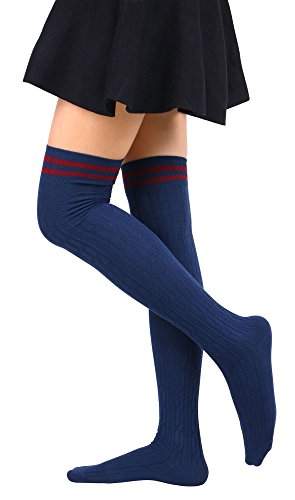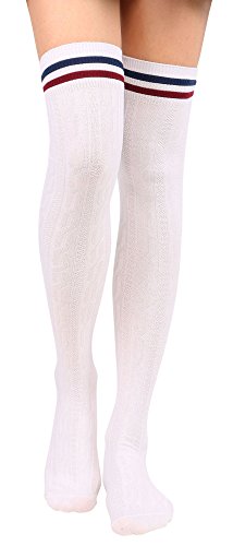 -. Binding : Apparel -. Brand : Bawdy -. Department : womens -. Feature : Comfortable, breathable Knit Socks with a sporty athletic stripe detail above the knee/at the thigh / Great for wearing with your favorite skirts during the fall; the perfect piece for costumes/cosplay / Durable elastic at the thigh ensures socks won't slide down during the day / Low-lying seams and soft fabric ensure lasting comfort / Thin yet durable, these socks fit comfortably and look great with a wide variety of different shoe styles -. IsAdultProduct : 0 -. ProductGroup : Apparel -. ProductTypeName : SOCKSHOSIERY -. Title : Women's Thigh High Cable Knit Striped Winter Socks – 1-3 Packs