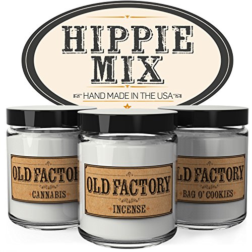 HIPPIE MIX themed gift set contains 3 different 4 ounce candles. Scents include Cannabis, Incense, Bag O' Cookies.