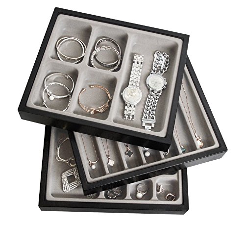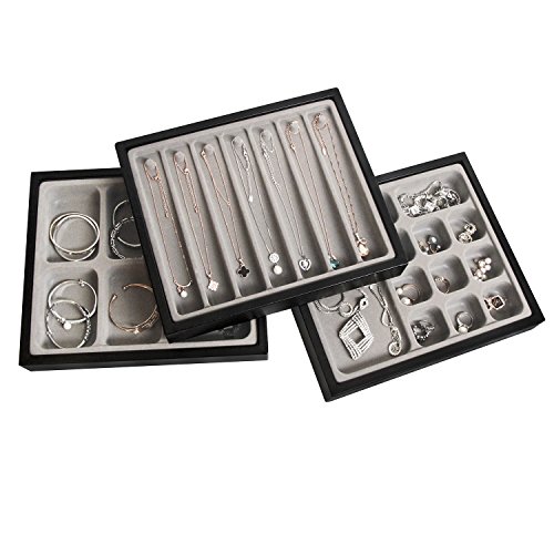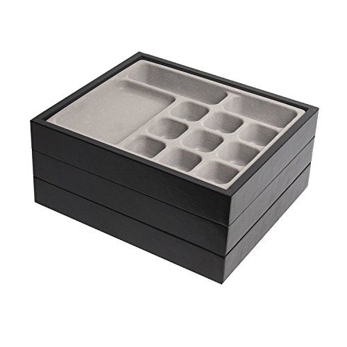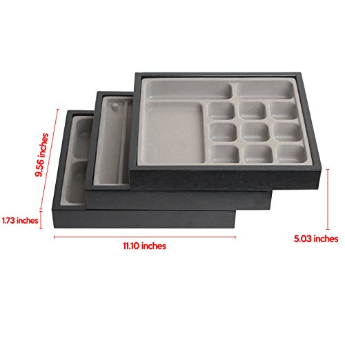SET OF 3 FOR ENOUGH STORAGE Each for 5, 7 and 12 compartments for necklace, earring, bracelet and rings STYLISH STACKABLE FOR SPACE SAVING Stylish Stackable design to match everywhere like living room, dressing table, store and makeup table HIGH QUALITY LEATHER Made by High quality synthetic leather so it is really luxurious and gorgeous PERFECT DISPLAY FOR JEWELRY Perfect to organize and display your valuable and important jewelry visibly SIZE 11 x 9.5 x 1.8 inches 0 |