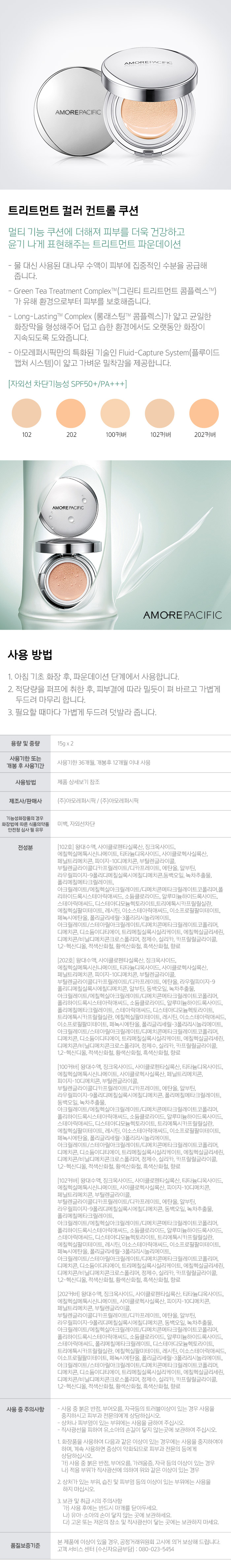 | 트리트먼트 컬러 컨트롤 쿠션 102호 본품15g+리필15g ※구성품은 이미지 사진과 다를 수 있으며, 품절시 사전 예고 없이 변경될 수 있습니다. |