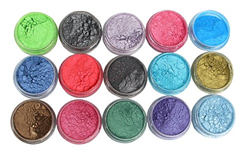 - 15 Colors Powder Pigment-Each Colors in 3 grams transparent case with Tong Brown,Dark Blue,Green,Glitter Blue,Glitter Black,Bronze Gold,Red,Light Purple,Violet,Silver,Light Blue,Rose,Dark Green,Sky Blue colors.