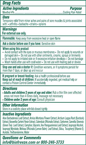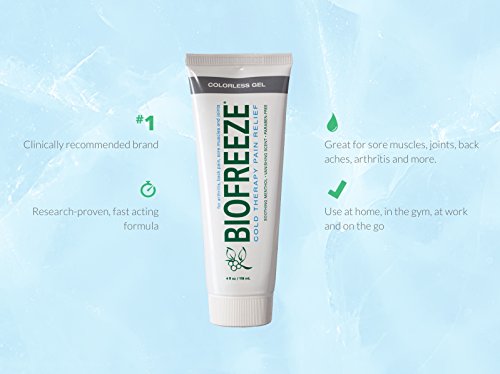 -. Feature : Biofreeze Pain Reliever is the #1 clinically used and recommended topical analgesic of hands-on healthcare professionals and for best results use in combination with their care (find one in your area on the Biofreeze website) / Chiropractors, physical therapists, massage therapists, podiatrists and athletic trainers use Biofreeze to provide immediate relief from many common conditions such as arthritis and other causes of muscle and joint pain / Biofreeze applies easily and penetrates quickly to relieve aches and pains related to sore muscles and joints, sprains, strains and bruises and can be applied to body parts such as the hand, wrist, elbow, foot, ankle, knee, hip, back, neck and shoulders / This legendary pain relief formula is clinical research-proven, fast acting and long lasting, completely free of parabens and propylene glycol, made with USP grade ingredients, and available in both original green and dye-free versions / The 4 Ounce Gel Tube is particularly well-suited for massage applications on larger muscle areas that benefit from the hands-on approach