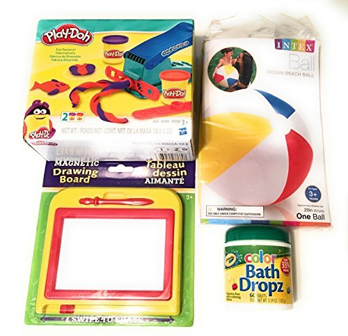 Includes: Playdoh Fun Factory, Magnetic Drawing Board, Beach Ball and 60 ct Crayola Color Dropz